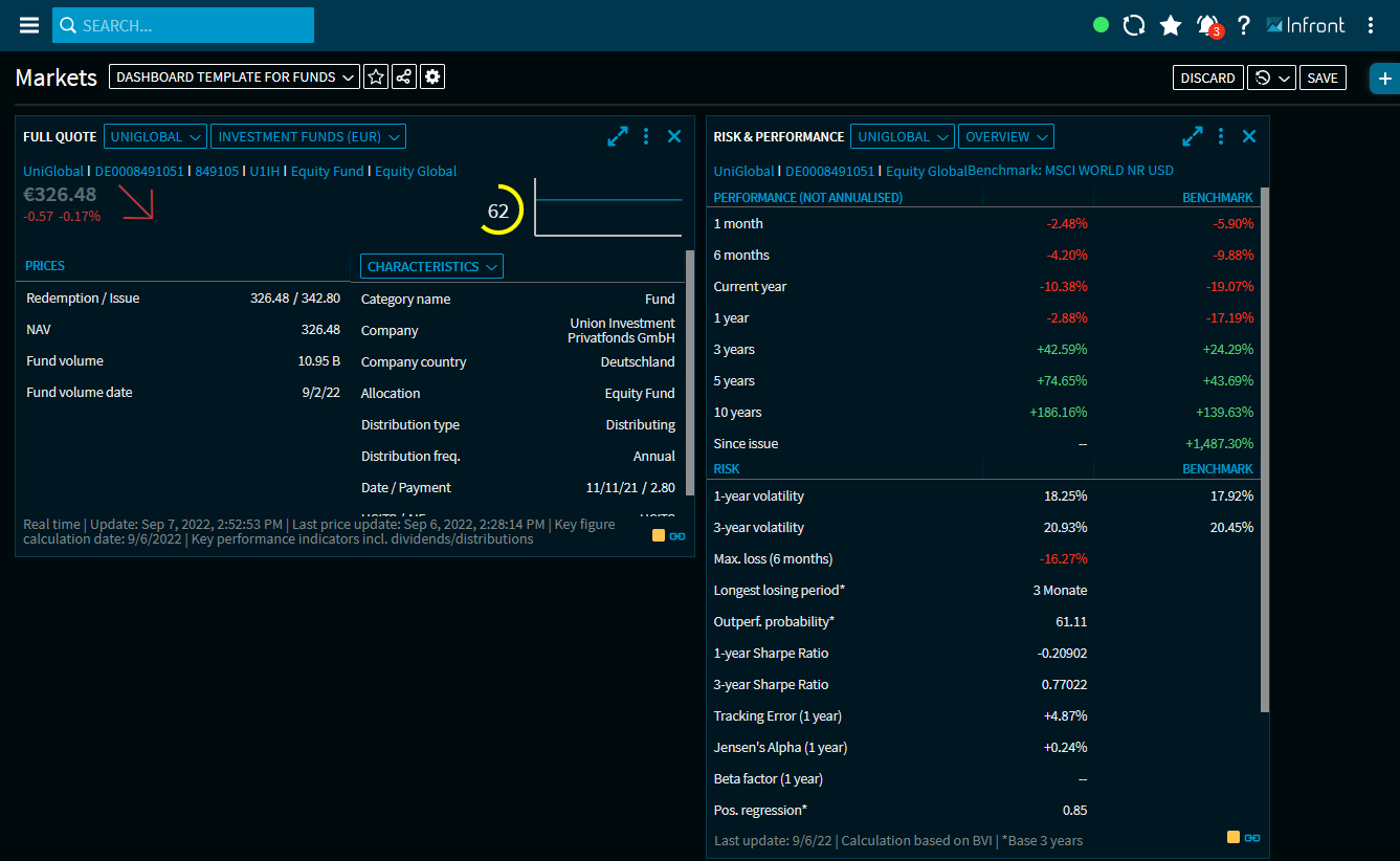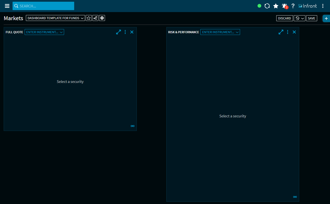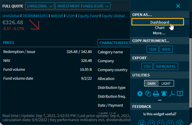 Open another dashboard or the Screener and select "Open as dashboard" from the widget menu. The selected fund opens in the previously created dashboard template: