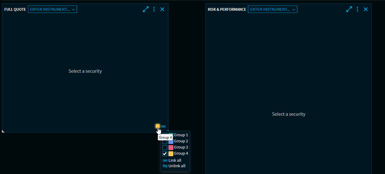 Open the Widget Gallery and place the "Full Quote" and "Risk & Performance" widgets on the dashboard.