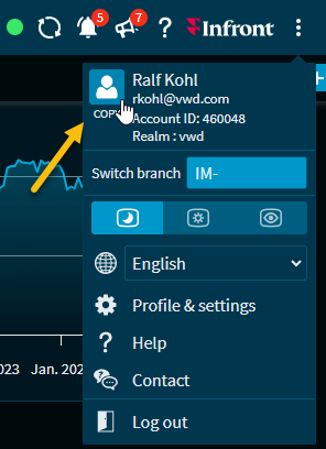 In the settings menu on the right-hand side, you have the option of copying user information (name, e-mail, login, institute, basic product, realm and account ID) to the clipboard, for example to copy it to tickets.