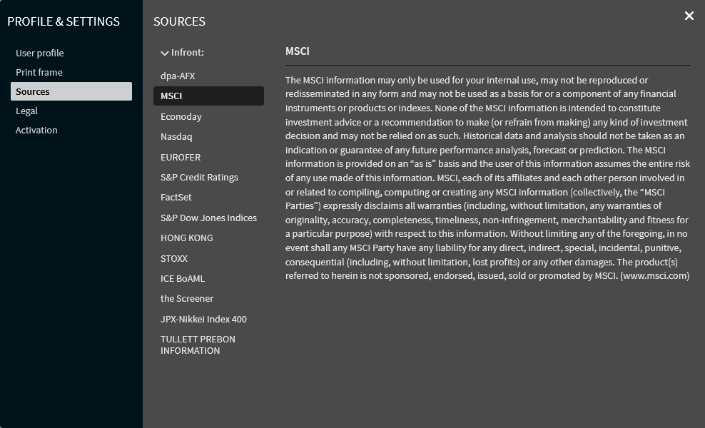 In the "Sources" area, you see your current data sources. Click an entry to expand the disclaimer of the corresponding provider.