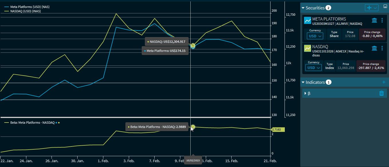 The "Beta" indicator calculates the beta between two securities or between security and benchmark/index. This means that at least two securities (or at least two time series) must be displayed in the "Chart analysis" widget. In the indicator settings, select the corresponding time series or securities.