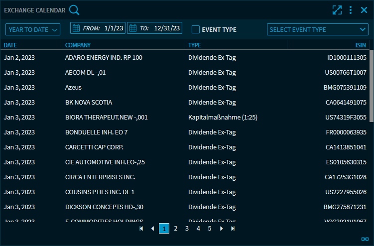 If you don't select a security, then all dates existing in the period are listed. Use the upper drop-down list to select a security and thus filter the calendar for the corresponding events.
