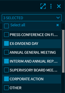 "Security" selection | In the upper area of the widget, you find the security selection drop-down list. When you select a security by using the quick search, only the dates for this security are shown. If you have already selected a security, you can clear the "Company" checkbox visible when selecting the security to return to the complete list. When you select the "Company" checkbox again, the list is filtered by the corresponding share. |