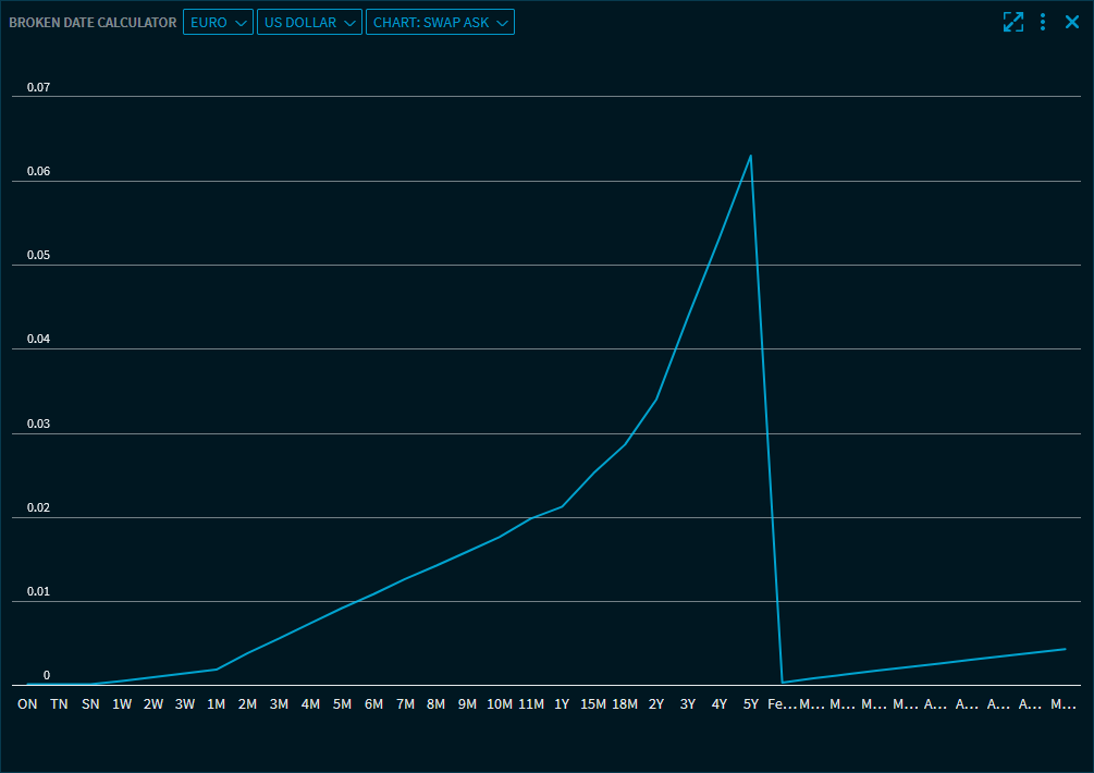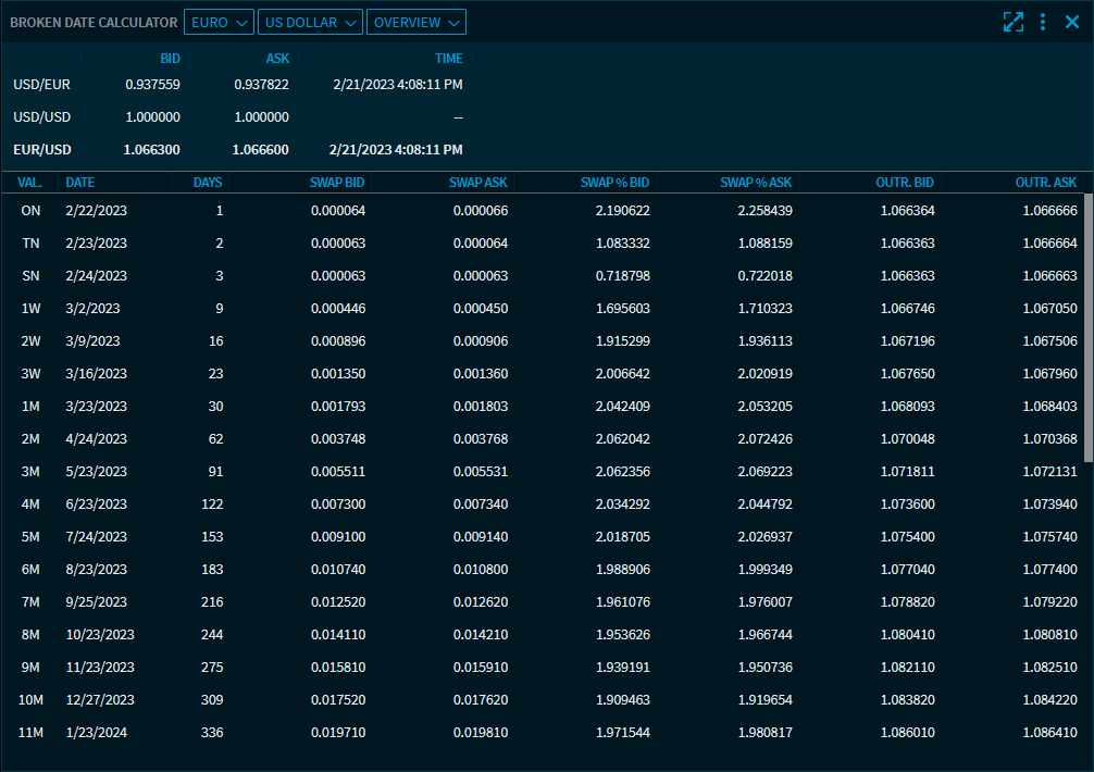 The Broken Date Calculator calculates forward rates for all common maturities. In addition to the forward rates (outright), the corresponding swaps and relative swaps (swaps %) are displayed. Bid and ask prices are available for all indicators.
