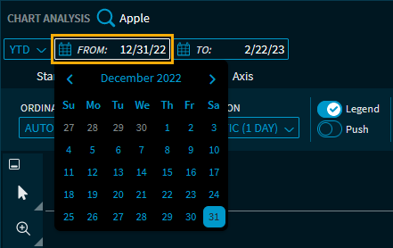 The "Max." period shows all available prices for the currently selected security. The currently selected dates are displayed in the two input fields "From" and "To". Here, you can also select individual periods using the calendar integrated in the fields: ![]() The period selection shows the "Custom" entry for manually changed data. You can also select ‘Today’ for the to date in the chart widgets. In this case, the chart is then automatically displayed up to the current date when the Infront Investment Manager is started on a later day. To manually select the appropriate aggregation for your time period settings, see Settings on the "View" tab. |