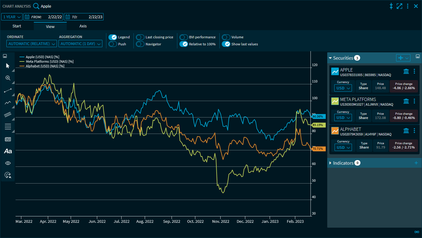 Indicators | At the bottom of the securities selection window, you will find the technical indicators for chart analysis. See also the section Indicators in the "Chart Analysis" widget. |
