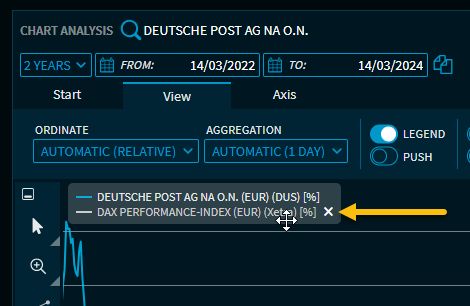 Legend | In the legend, you see all time series of the chart window, the colours are assigned accordingly. Clicking a time series hides it from the chart. You can move the legend by dragging it. You can remove displayed benchmarks or indicators from the legend: Point to the legend entry you want to remove. This displays a remove icon behind it, which you can use to quickly remove this chart line. ![]() |
