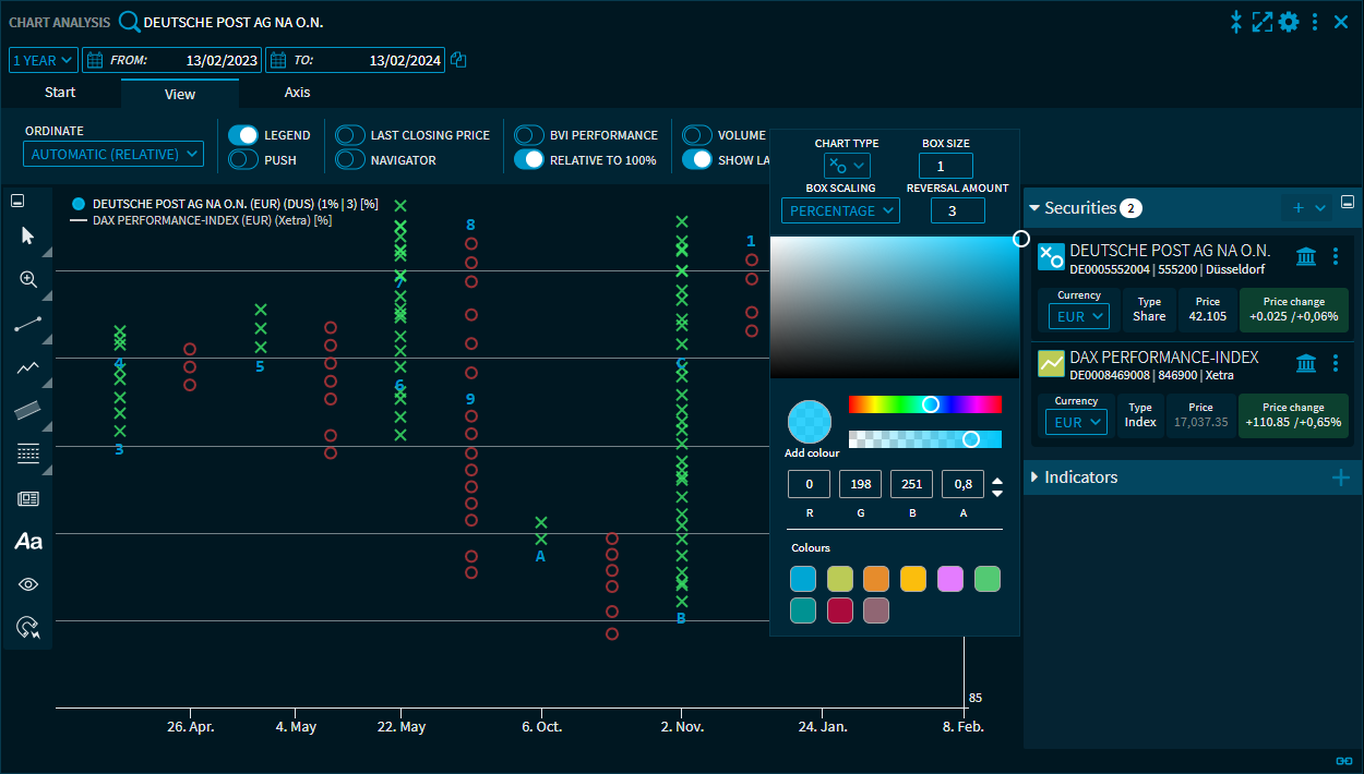 In the settings for the "Point & Figure" chart type, "Percentage" can now be selected for the box size type.