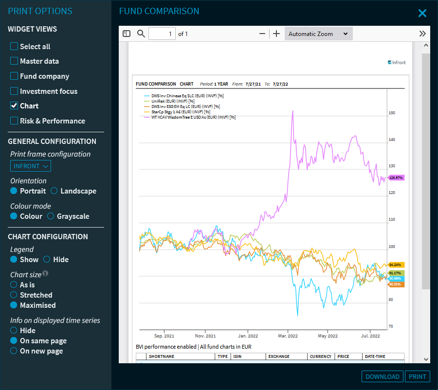 You can display detailed information on the securities in the chart in a table. Use the options to decide whether and where this table should appear. The following information is available: