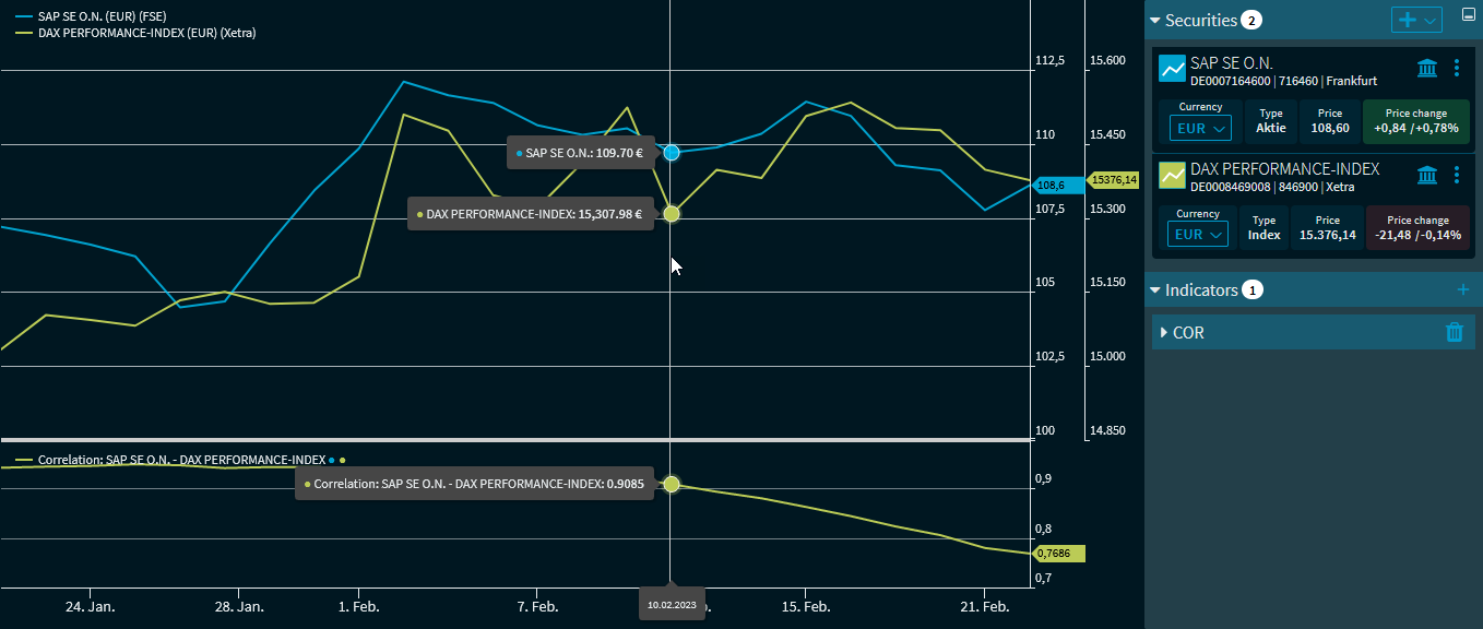 The "Correlation" indicator calculates the correlation between two securities. This means that at least two securities (or at least two time series) must be displayed in the "Chart analysis" widget. In the indicator settings, select the corresponding time series or securities.