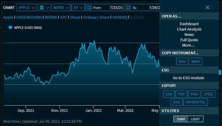 If you have licensed the Infront Excel Add-In, a corresponding "INFRONTXL" button for the export is available in the "Chart" and "Full Quote" widgets as well as in watchlists.