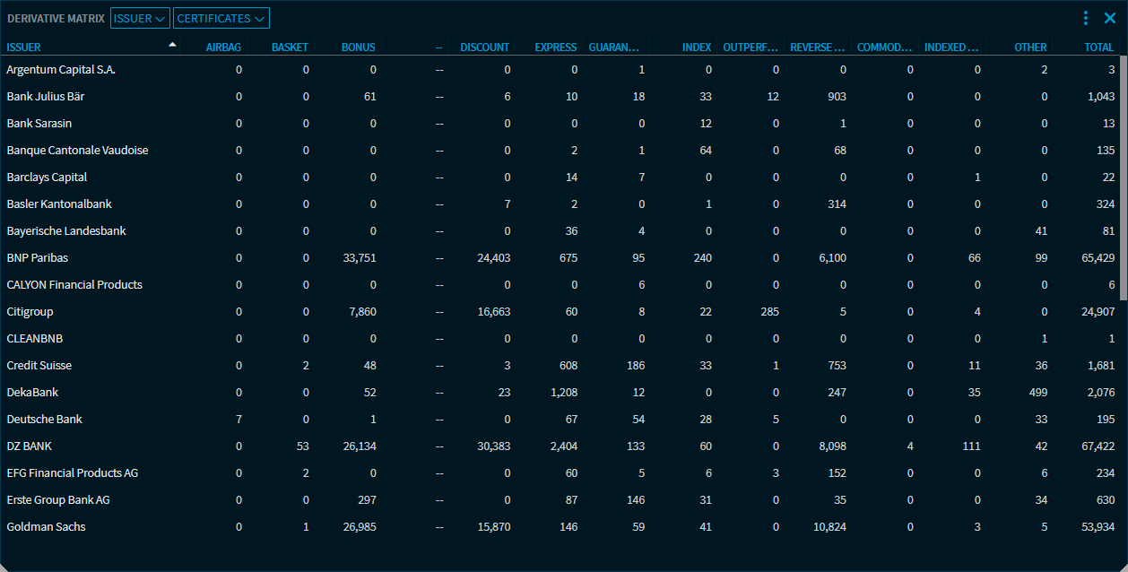 You see the number of certificates or leveraged products offered by the individual issuers for each derivative category. In addition, the "Derivative Matrix" widget also shows the total for each issuer (in the "Total" column) and for each certificate type (in the "Total" row). The sort and search functions allow you to find and display comprehensive information about the certificate market