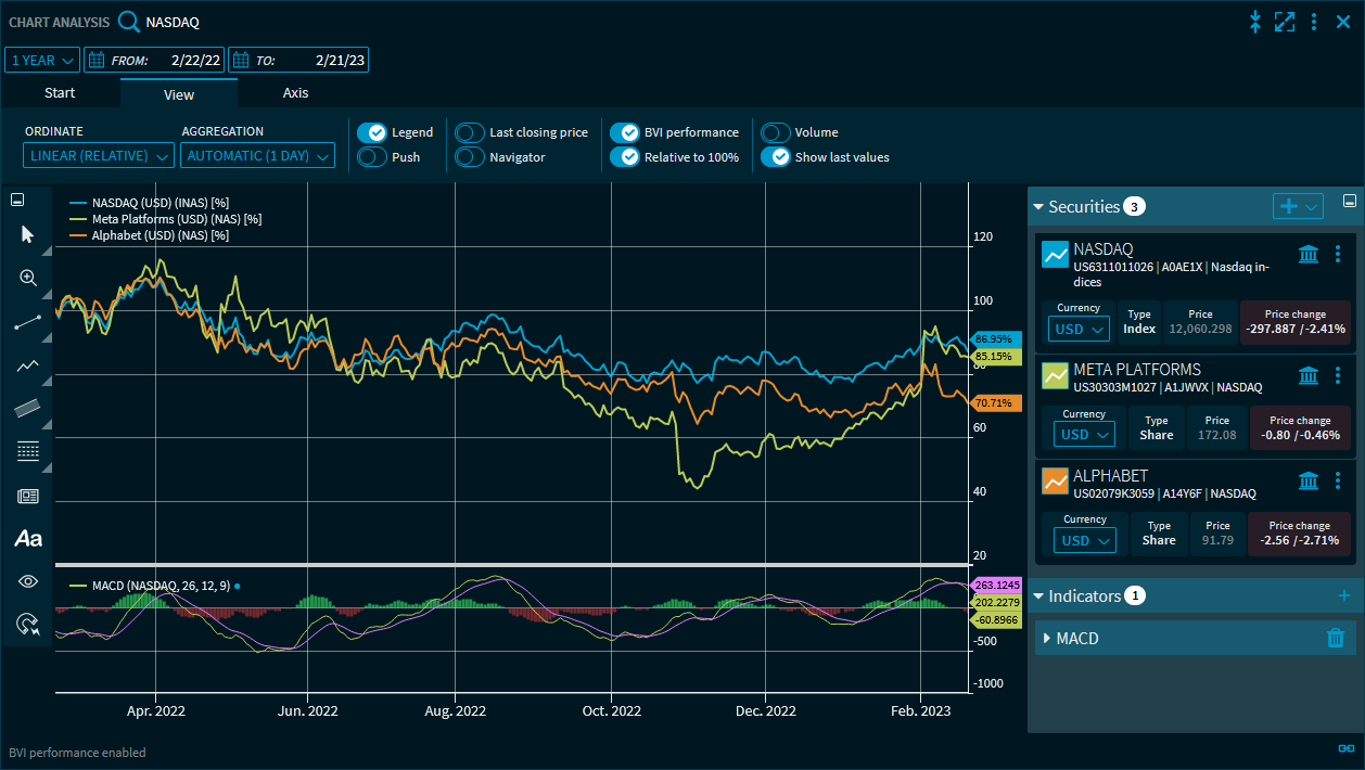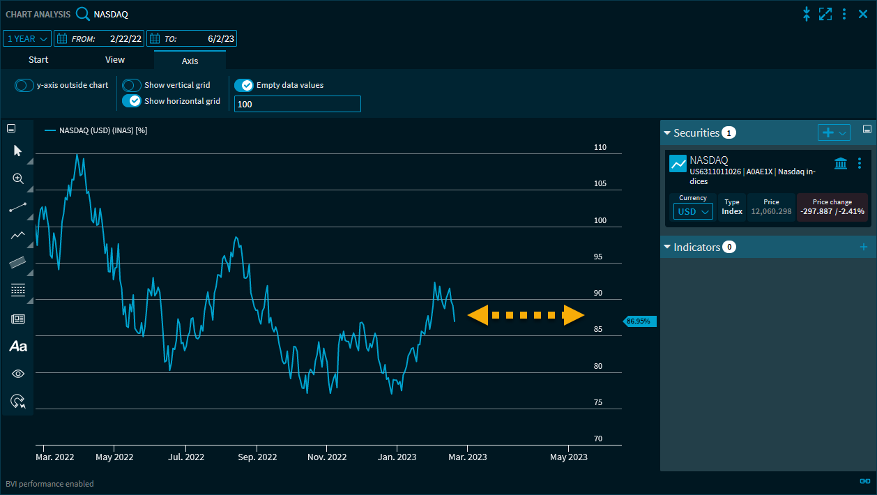 For derivatives, two absolute axes are displayed by default for the instrument and the associated underlying. This means that, for example, any barriers or caps that may be present can also be displayed correctly.