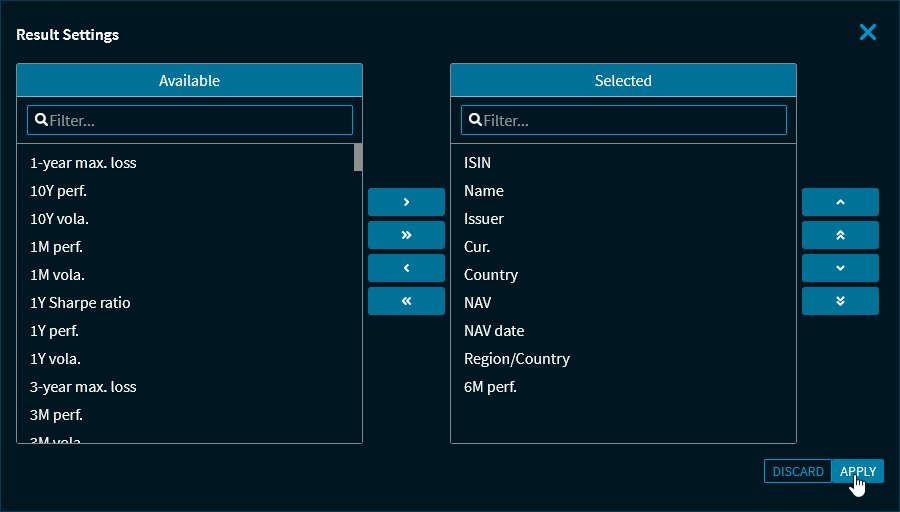 Save the selection with the "Apply" button. This closes the "Result settings" dialogue window and updates the results list.