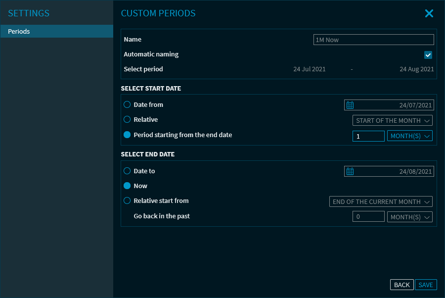 Selected period | Here, you can see the always updated period resulting from your settings. This data is not editable here. To set the calculation period, it is recommended to first define the methodology for the end date (Absolute date, Now, Relative to...). Then do the same for the start date. In the "Selected time period" row, you will then see the start and end date that results from the respective parameter selection. |