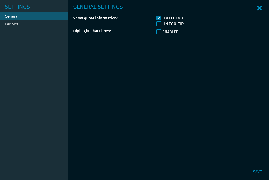 Show prices | In this area, you can select whether you want to show the price display in the legend (default setting) or as a tooltip hovering over the chart lines. Select the relevant checkboxes. |