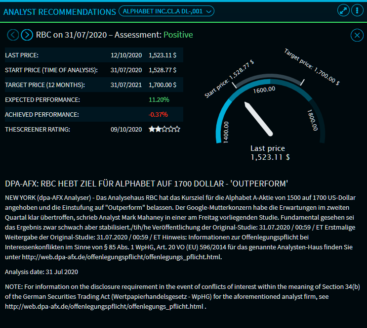 Source and recommendation | Below the security selection, you find further information about the financial analyst, analysis date as well as the assessment of the currently selected individual recommendation. |