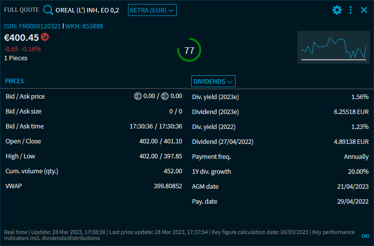 The "Full Quote" widget of a security provides all basic information about an instrument. The widget shows the most important market and master data optimised for a security type.