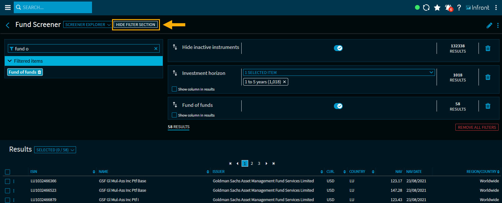 The results lists are displayed at the bottom of the screen and can be maximised by clicking the "Hide filters" button.