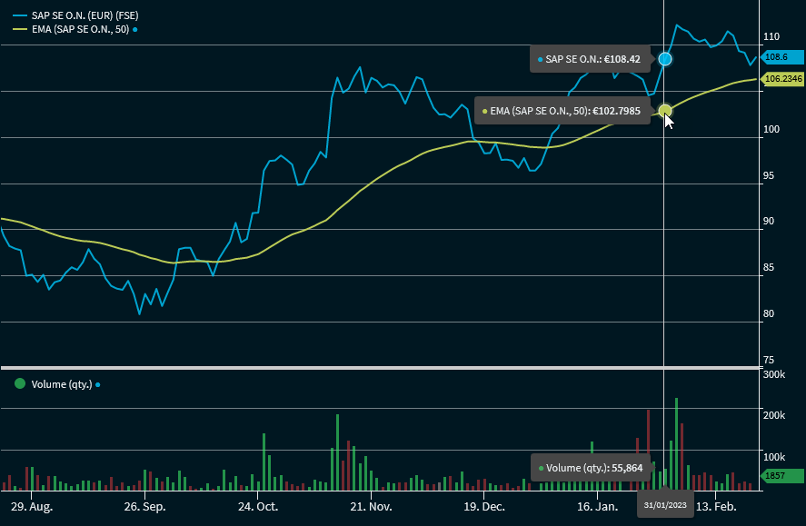 The Exponential Moving Average ("EMA") is an extension of the weighted moving average. Not only does it rule out the criticism that all price data is weighted equally (as is the case with the Simple Moving Average), it also takes into account all available price data. This means that prices outside the selected parameter no longer fall outside the calculation.