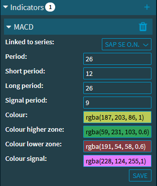 If you have displayed the technical indicators in the "Chart Analysis" widget as described in Show indicators, then you can select their chart colours individually. To do this, follow these steps: