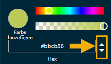 - Enter the hexadecimal code, RGB or HSLA values; the selection is made using the arrows to the right of the input field: