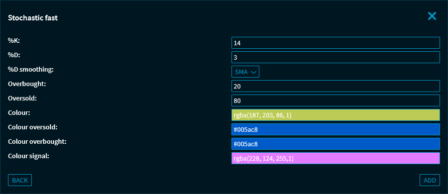 The stochastic is based on 2 lines, the %K line and the %D line. The %D line is a MA of the %K line. Both lines vary between 0 and 100. In addition to this Fast Stochastic indicator, the Slow Stochastic is also calculated. In this case, the %D line is taken as a basis and a MA is calculated on its basis.