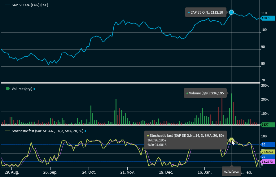 A value of 0 (zero) indicates that the current closing price is the lowest price in the observation period, conversely a value of 100 indicates that the closing price is the highest value. As with RSI, values close to the maximum indicate overbought situations, values close to the minimum indicate oversold situations. A crossing of the upper extreme line (usually at 70-80%) from top to bottom generates a sell signal, a crossing of the lower extreme line (usually at 20-30%) from bottom to top generates a buy signal.