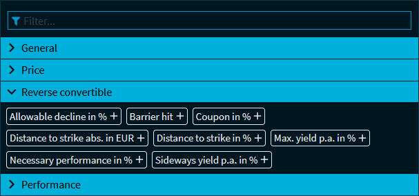 In addition to the filters described in Filters in certificate screens (security group "All"), the following filters are available for reverse convertible bonds: