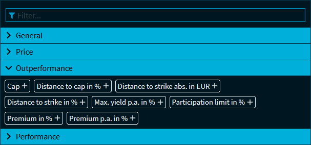 In addition to the filters described in Filters in certificate screens (security group "All"), the following filter is available for outperformance certificates: