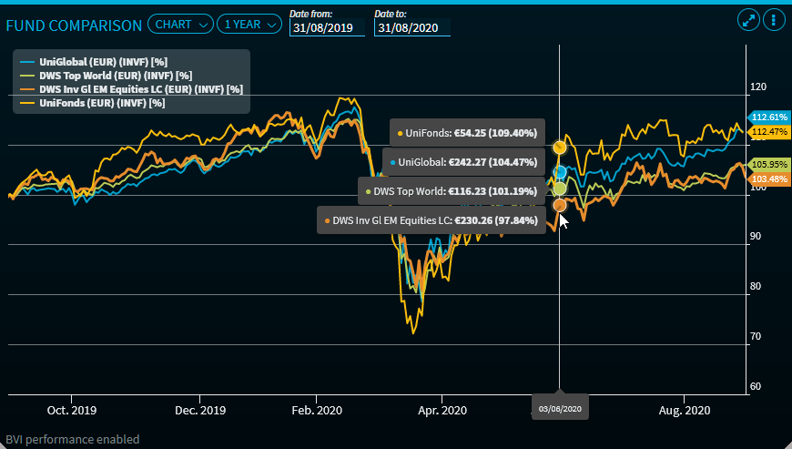 "1 year" is set by default, showing the performance of the funds over the last 12 months. The 100 line corresponds to the level one year ago. Point to the time series to show the price information for a particular date.