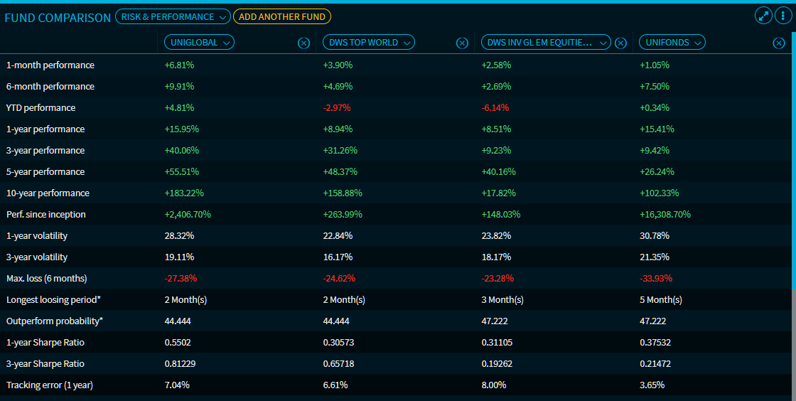 From the drop-down list at the top, select the "Risk & Performance" view to display the most important performance and risk key indicators for the funds selected.