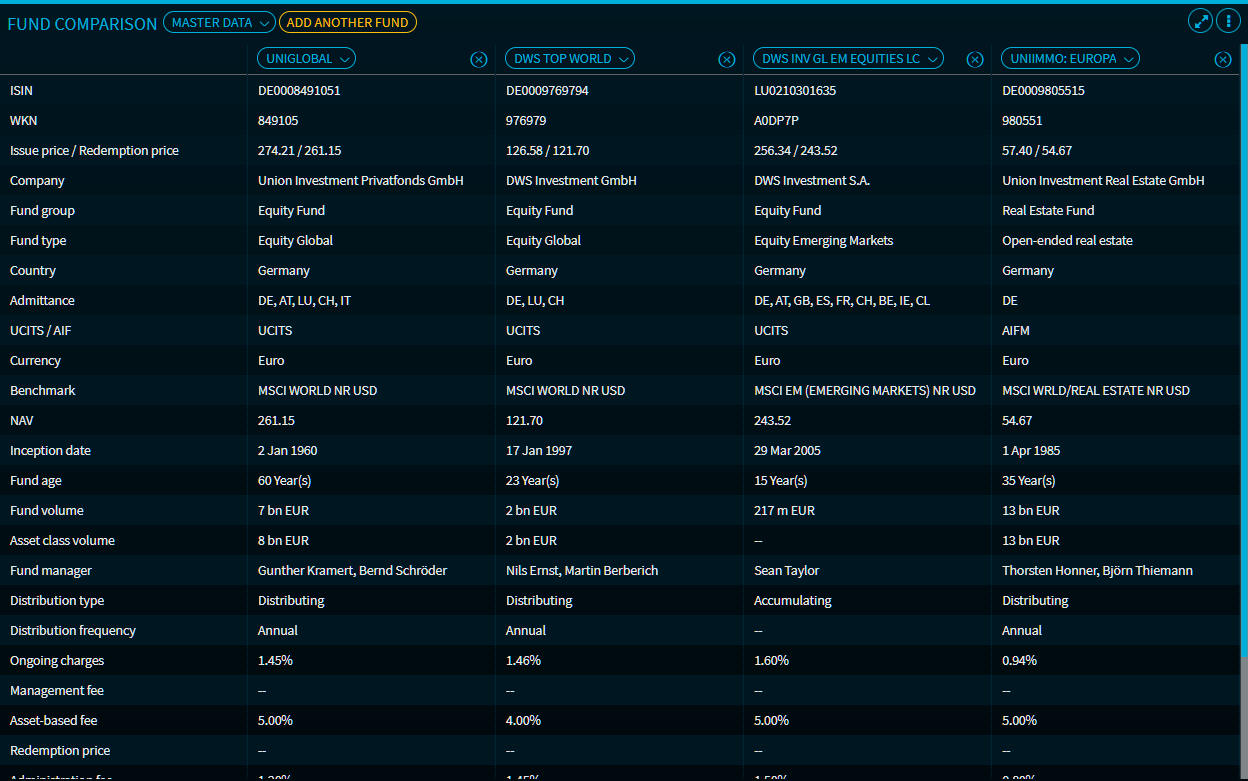 The "Master data" view allows you to compare the funds using the following criteria: