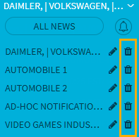 Having saved your custom news search (see Save news search), you can delete them it at any time. You can do this in two ways.