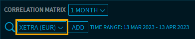 Use the trading venue drop-down list to select a trading venue for the correlation matrix. The currently selected trading venue is always shown on the drop-down button (here "XETRA").