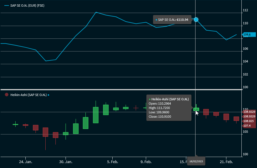 Heikin-Ashi candlesticks calculate candlesticks based on the open and close prices of the last period and the open, high, low and close prices of the current period. The resulting candlesticks filter out disturbances and facilitate the recognition of existing trends.