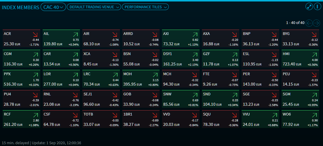 In the tile view, the colour of the tiles indicates the current price development of the securities. In the example, most of the DAX members are red, that is, they trend lower.