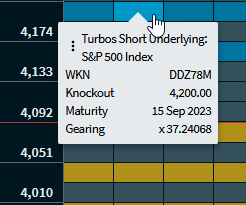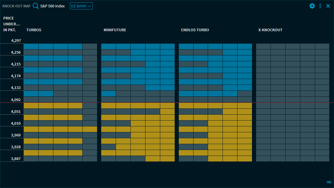 At the top of the widget, select the underlying and the issuer of the knock-outs. The currency of the underlying is shown above the graphic (in the figure, you see the DAX in "points").