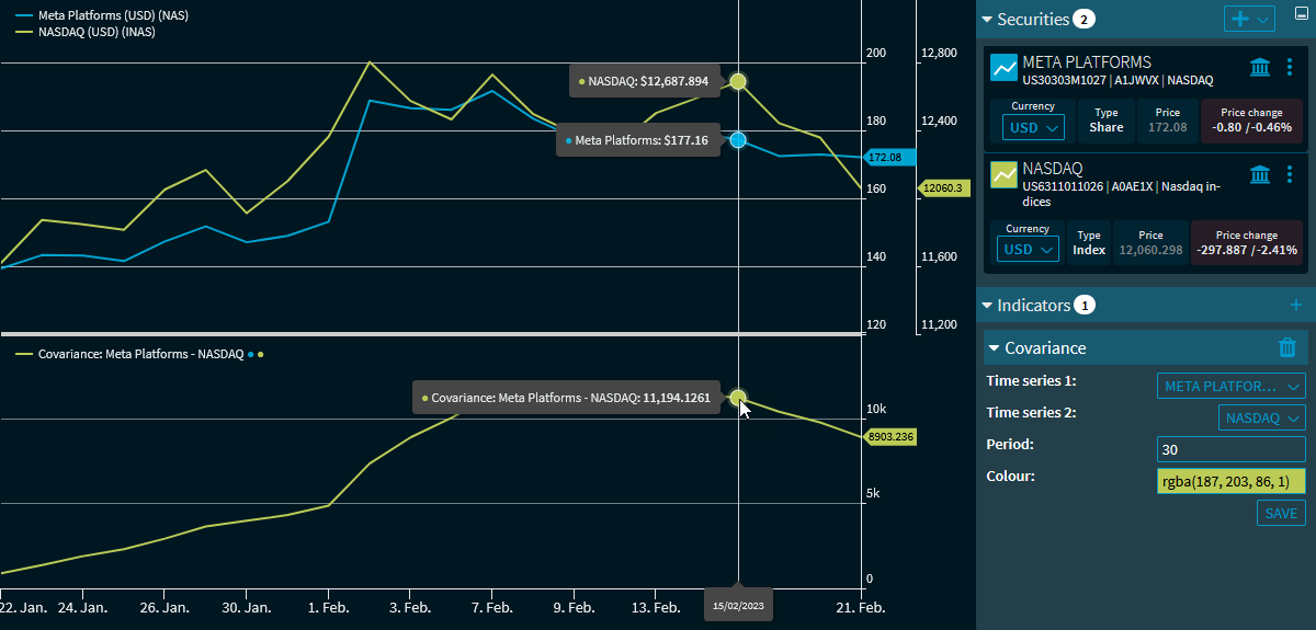 The "Covariance" indicator calculates the covariance between two securities. This means that at least two securities (or at least two time series) must be displayed in the "Chart analysis" widget. In the indicator settings, select the corresponding time series or securities.