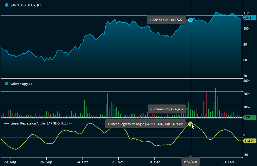 The Linear Regression Angle is designed to identify emerging and weakening trends. The angle of a regression channel is calculated and displayed.