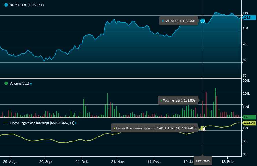 The Linear Regression provides the value of the regression constant, that is, the respective mathematical intersection of the regression line with the price axis. The two values"Slope" and "Intercept" clearly define a straight line.