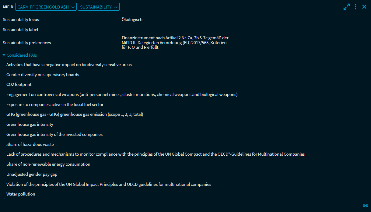| Considered PAIs | Here, you can find the list of PAIs ("Principal Adverse Impacts") considered. You can open and close this list by using the arrow icon on the left side. |
