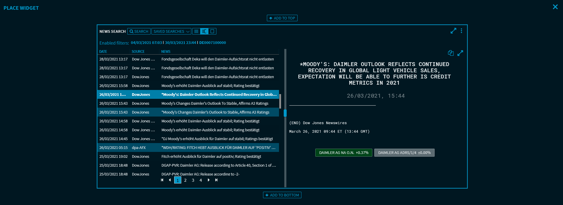 - If you release the mouse button, a "News Search" widget for the security for this period will be opened directly. Decide where the widget should be inserted in the dashboard.