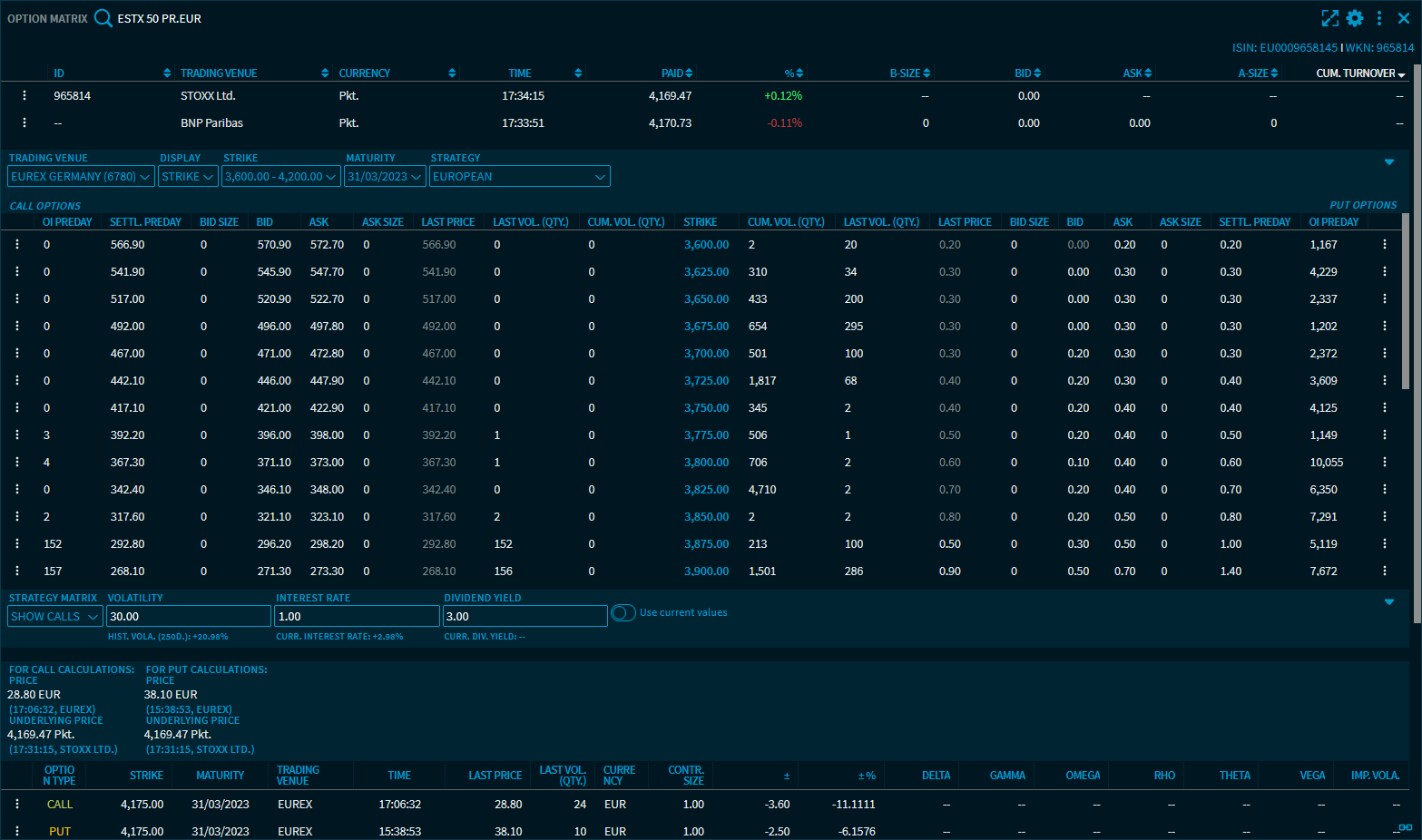 In addition to the prices of the underlying and the actual option matrix that you can filter by strike price or maturity, the option matrix also displays all important key figures for the calls and puts selected and shown in the matrix. The widget also provides a so-called "Strategy Matrix" that determines the estimated fair value for various scenarios and the corresponding maturity.