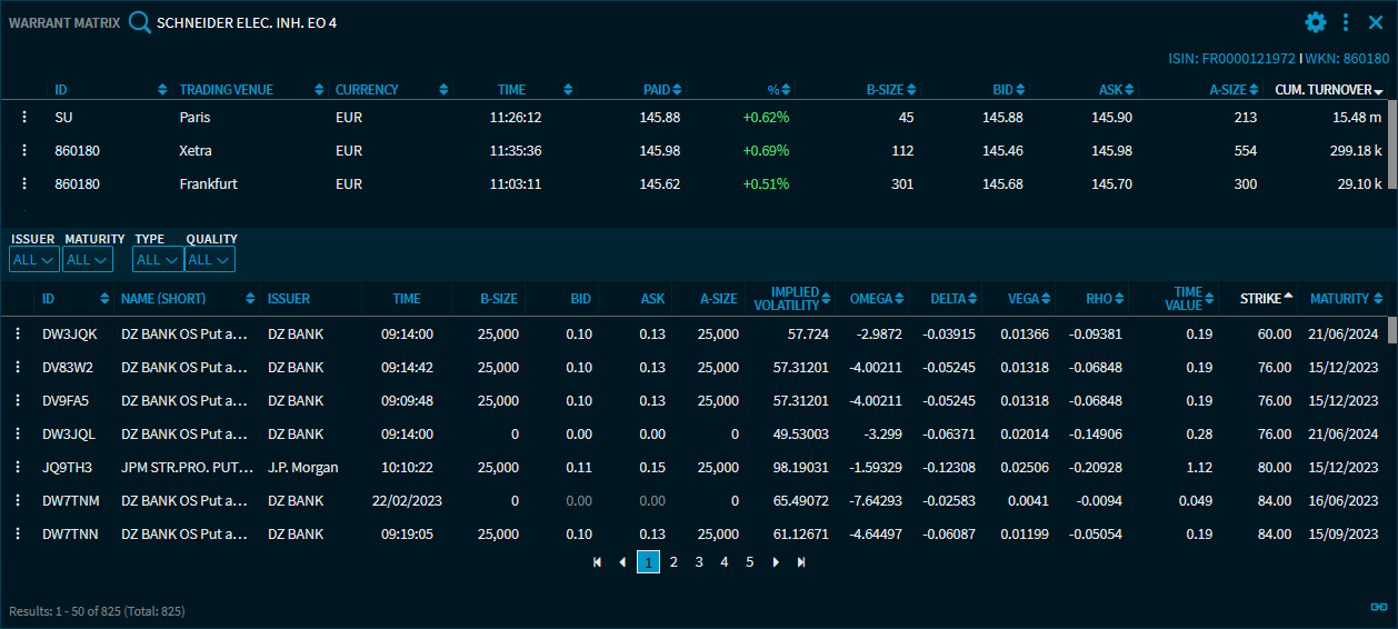 The "Warrant Matrix" widget offers an overview of the warrants for an underlying. The matrix can be filtered by various criteria such as issuer, maturity or strike price.