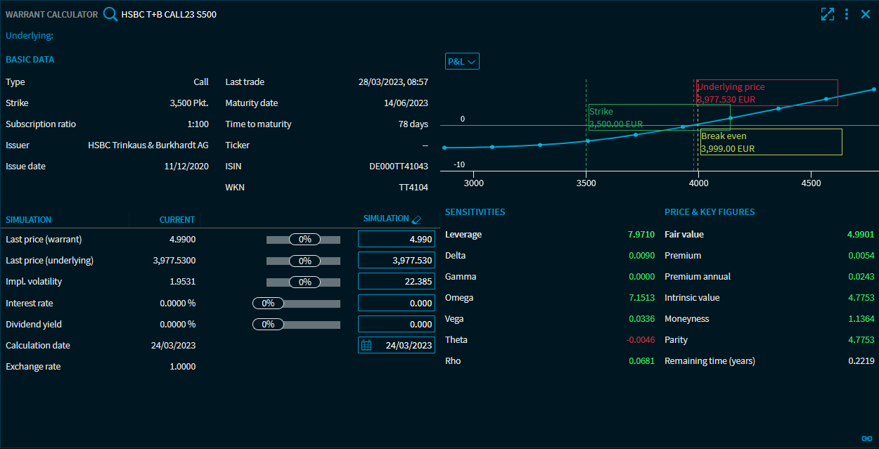 With the "Warrant Calculator", you can simulate various scenarios of the performance of a warrant. The "Warrants Calculator" widget provides a comprehensive overview of all important data, simulation results and key figures.
