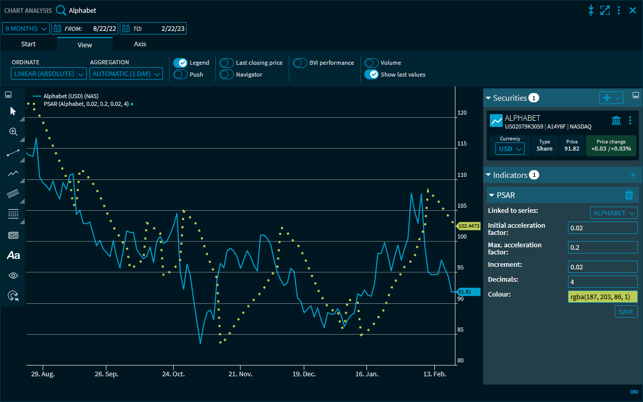The PSAR is constantly in the market, which means that every time the PSAR cuts the price curve, a trading signal is triggered. Please note that the PSAR requires a certain "warm-up time" and therefore the first signals should be ignored.