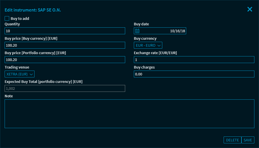 The fields correspond to those for recording positions. For more information, see Add position to portfolio.
