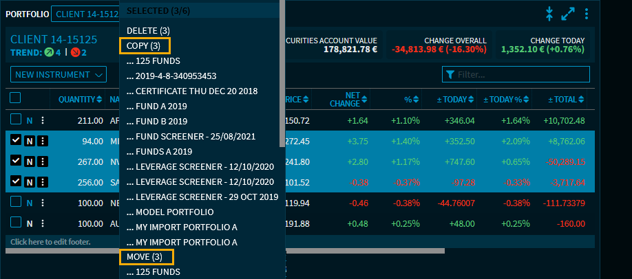 You can copy positions of a portfolio with all transaction data to another portfolio. When transferring positions, they are removed from the original portfolio.