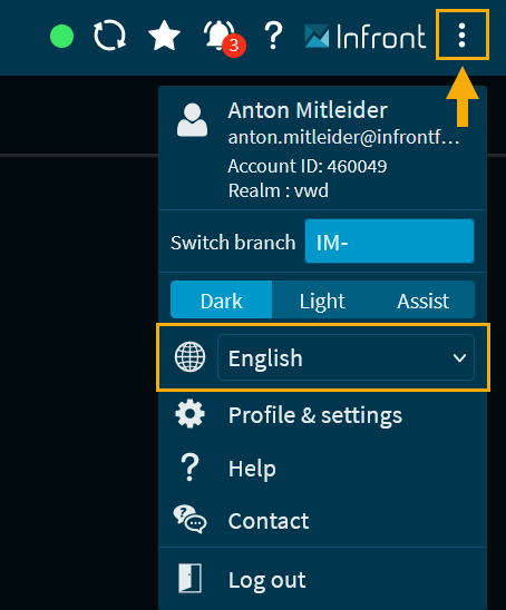 As an alternative to the login page, you can also change the language in the open Infront Investment Manager at any time. You will find a corresponding drop-down list in the settings menu: